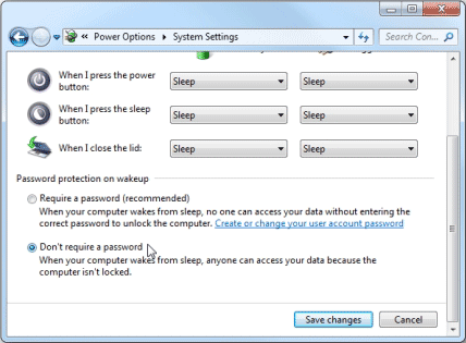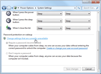 - 单击更改当前不可用的链接的设置在唤醒时密码保护部分。这将启用链接下方的两个选项。
