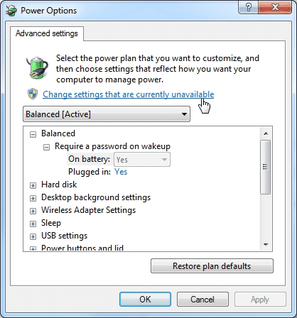 - 单击更改当前不可用的设置关联。这将使在电池上列表框中的下拉列表。