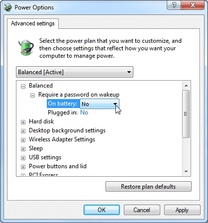 - 选择不来自在电池上在唤醒节点上需要密码下的下拉列表。