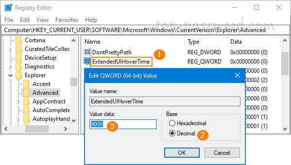 命名新DWORDExtendedUihovertime。接下来,双击它,然后将其价值数据更改为9000个小数。 Windows 10将在9000毫秒(或9秒)悬停在任务栏上的任何打开应用程序上,显示缩略图预览。这应该足以有效地禁用任务栏缩略图预览功能。
