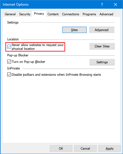 - 将打开“Internet 选项”对话框。点击隐私选项卡并选中“切勿允许网站请求您的实际位置“。单击“确定”即可完成!