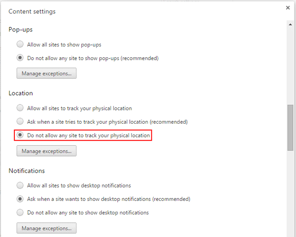 - 向下滚动到位置部分并选择“不允许任何网站跟踪您的物理位置“。现在点击完毕