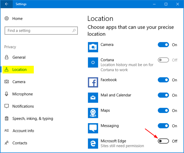- 选择地点左侧的选项卡。向下滚动到“选择可以使用您的精确位置的应用程序”部分,然后转动 Microsoft Edge 旁边的滑块以离开。