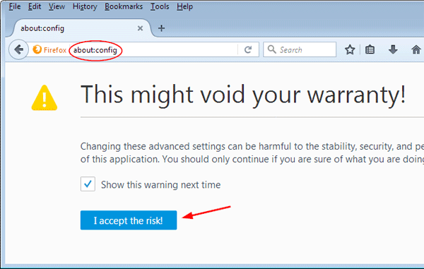- 打开火狐浏览器。类型关于:配置进入地址栏并按 Enter。