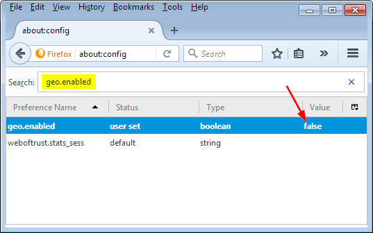 - 类型地理启用进入搜索框并按 Enter 键。应显示“Geo Enabled”选项。用鼠标双击该选项将其禁用。