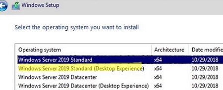 - 当您在 Windows Server 安装窗口中选择安装选项时,选择升级和Windows Server 2019 标准版(桌面体验);