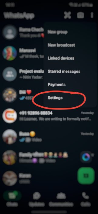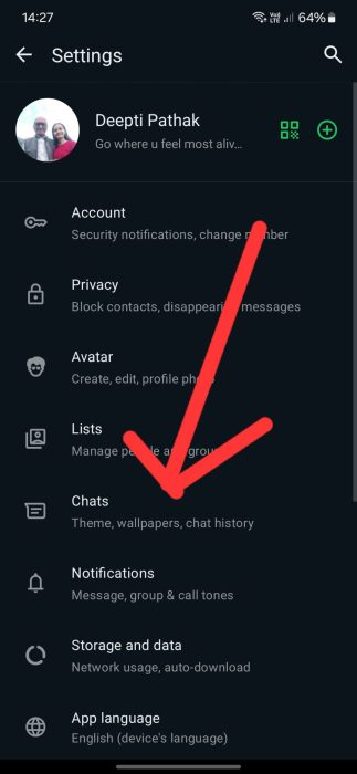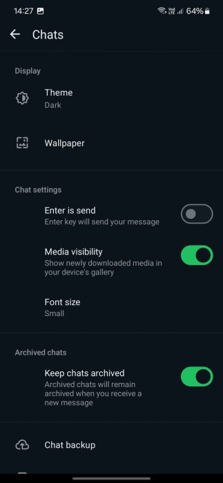 检查 WhatsApp 设置中“聊天”下是否启用了媒体可见性。此选项允许下载的视频出现在您的图库中。