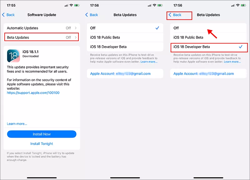 步骤3:轻敲测试版更新并选择iOS 18 开发者测试版。之后,点击后退左上角的图标。