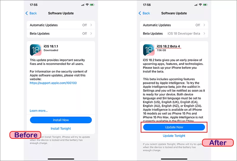 第4步:现在,最新的iOS测试版已经发布。您可以直接点击立即更新如果您之前已经创建了 iPhone 的备份,请点击 按钮将 iOS 18 Beta 安装在您的 iPhone 上。