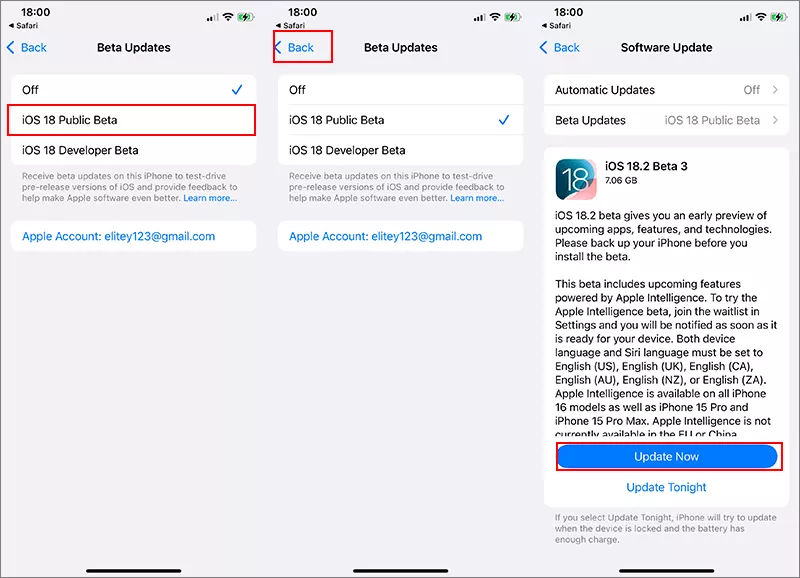 步骤3:现在,您可以选择iOS 18 Public Beta。之后,单击后退左上角图标,可以看到屏幕上显示iOS 18 Public Beta。您可以点击立即更新如果 iPhone 中的所有内容都有备份,请安装 Beta 版。