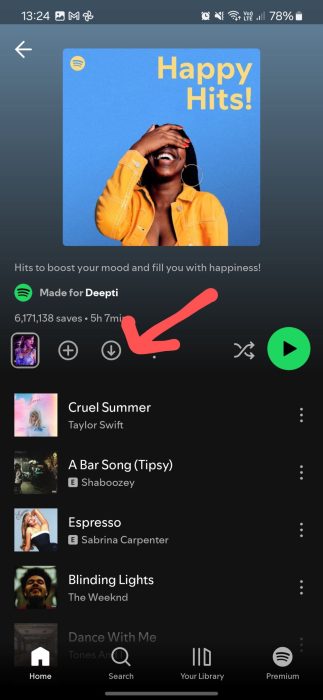 - 点击下载播放列表或歌曲旁边的按钮。这将开始将歌曲下载到您的设备。