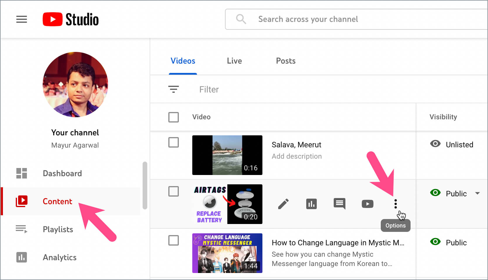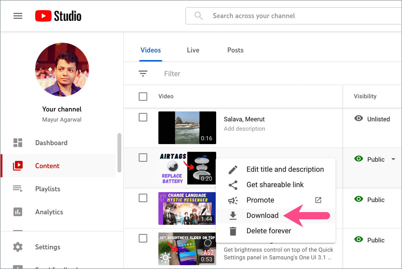 - 转到'内容”(在左侧窗格中)并找到您要下载的 Shorts 视频。
