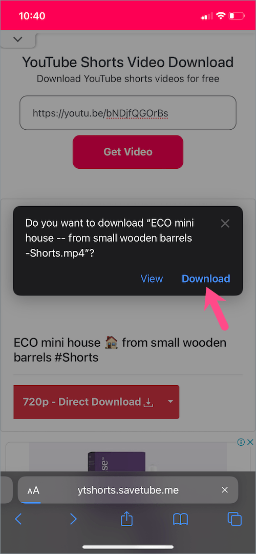- 点击“720p – 直接下载”按钮,然后点击“下载”以保存 YouTube 短片视频。