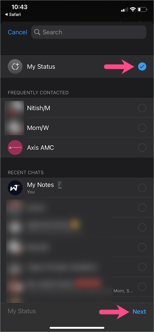 - 从共享表中选择“WhatsApp”,选择“我的状态”,然后单击“下一步”。