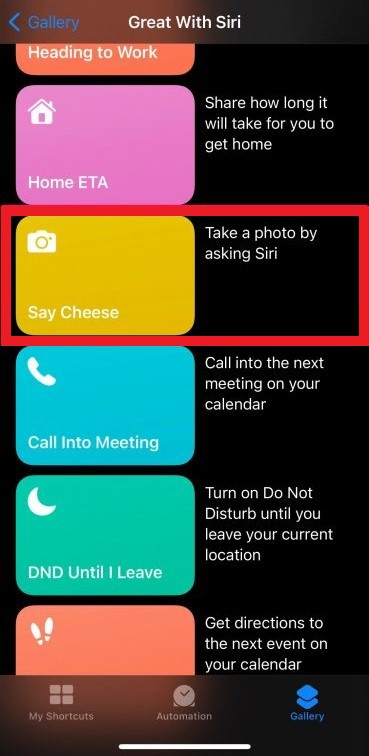 步骤3:在那里,搜索“Say Cheese”快捷方式,然后点击它。
