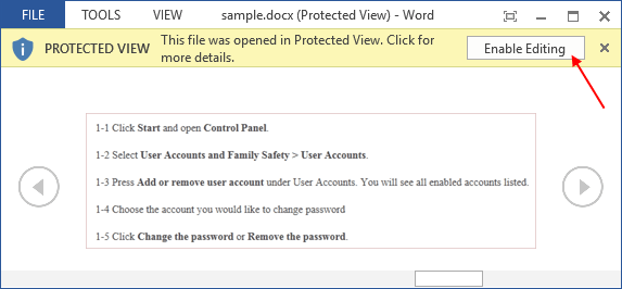 退出受保护的视图后,您有效地删除了保护,并且文件成为可信赖的文档。首先,此方法适用于Microsoft Office Word 2016,Word 2013,Word 2010和Word 2007。