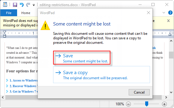 2。在WordPad中打开锁定文档时,它会自动解锁以进行编辑。您现在可以编辑和保存文件,而无需任何限制。