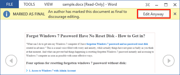 如何编辑由Mark锁定为最终或受保护的视图的Word文档