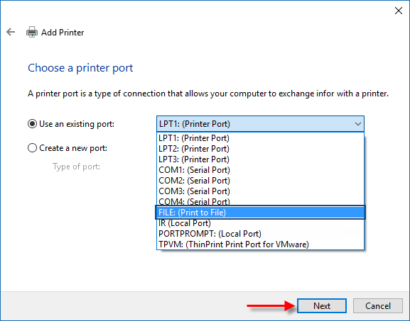 步骤5:选择使用现有端口, 选择文件:(打印到文件)从下拉菜单中,然后单击下一个。