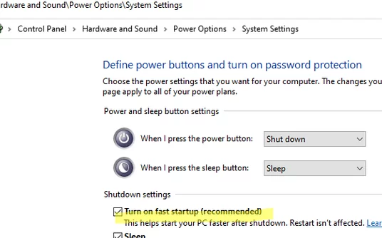 跑步powercfg.cpl并导航选择电源按钮的功能->更改当前不可用的设置-> 取消选中该选项开启快速启动(推荐)。