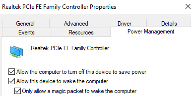 Get-NetAdapter -Physical | Set-NetAdapterPowerManagement -WakeOnMagicPacket Enabled -WakeOnPattern Enabled - 然后前往电源管理选项卡并允许网络适配器将计算机从睡眠模式唤醒。启用允许此设备唤醒计算机和只允许魔术包唤醒计算机选项。