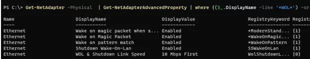 Get-NetAdapter -Physical | Get-NetAdapterAdvancedProperty | where {($_.DisplayName -like '*WOL*') -or ($_.DisplayName -like '*Wake*')}