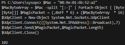 $UdpClient.Send($MagicPacket,$MagicPacket.Length)
