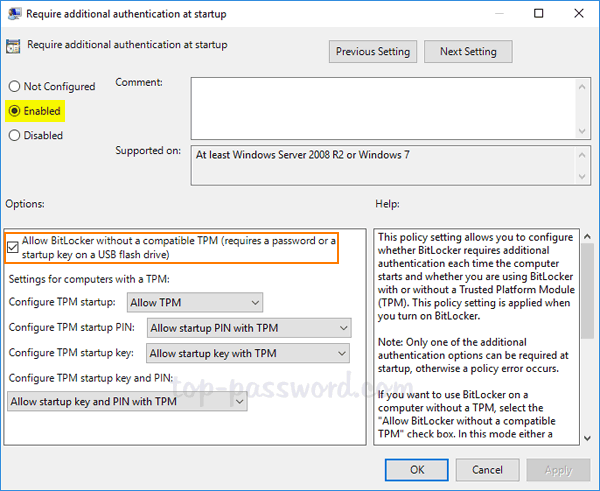 - 在顶部的单选按钮中,选择启用。勾选标有“在没有兼容 TPM 的情况下允许 BitLocker”。