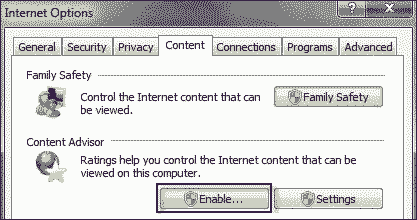 步骤 5:在“Internet 选项”对话框中,选择内容选项卡。然后你可以看到使能够按钮下内容顾问。点击使能够并在出现提示时确认“用户帐户控制”对话框。