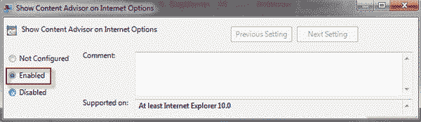 第三步:检查启用然后单击申请。这将使内容审查程序能够显示在“Internet 选项”对话框的“内容”选项卡上。 “未配置”或“禁用”表示隐藏内容审查程序。