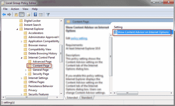 步骤 2:在本地组策略编辑器中,导航至用户配置 > 管理模板 > Windows 组件 > Internet Explorer > Internet 控制面板 > 内容页。单击内容页文件夹。然后双击在 Internet 选项上显示内容审查程序在右侧窗格中。