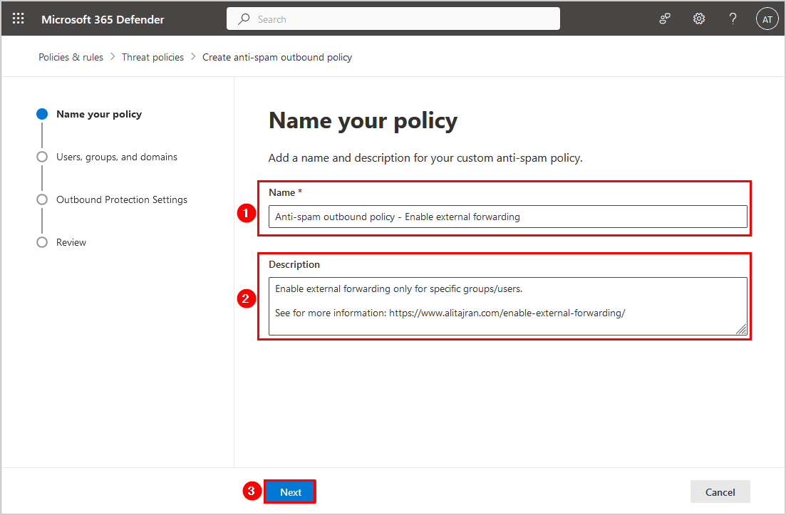 - 添加描述:仅对特定组/用户启用外部转发。有关更多信息,请参阅:https://www.alitajran.com/enable-external-forwarding/