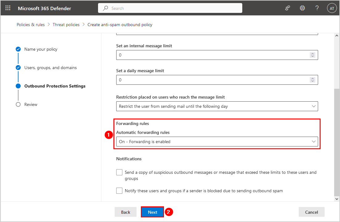 - 添加名称:反垃圾邮件出站策略 – 启用外部转发