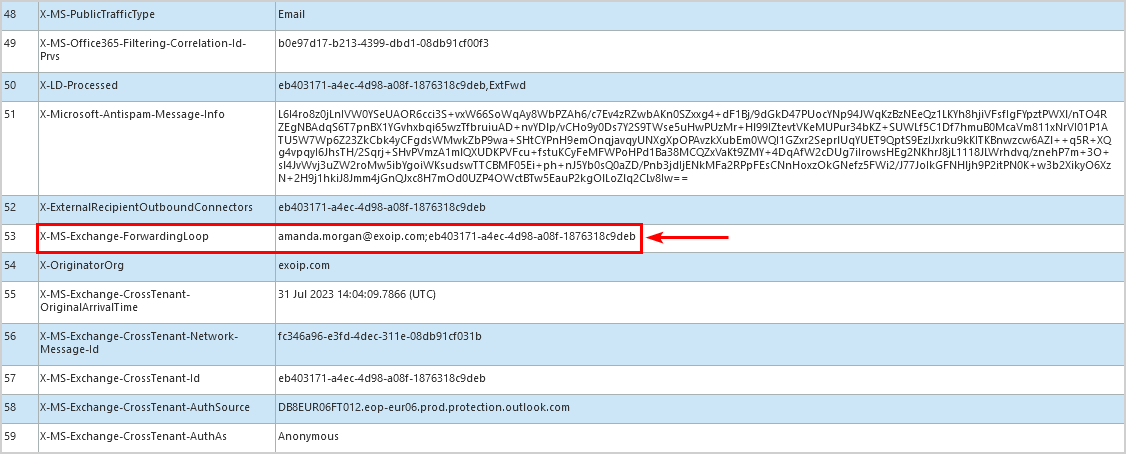 复制标题并将其粘贴到Microsoft 消息标头分析器。验证标题X-MS-交换-转发循环出现。