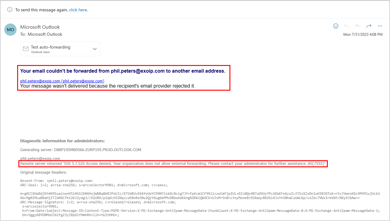 用户Phil不在EnableExternalForwarding组中,外部转发消息不起作用。 Phil 的收件箱中将显示一条 NDR 消息,其中包含以下消息: