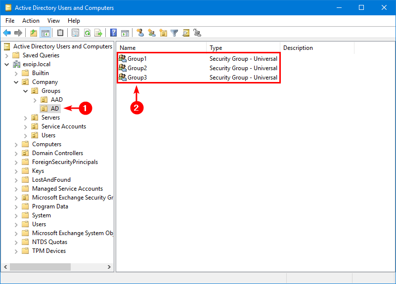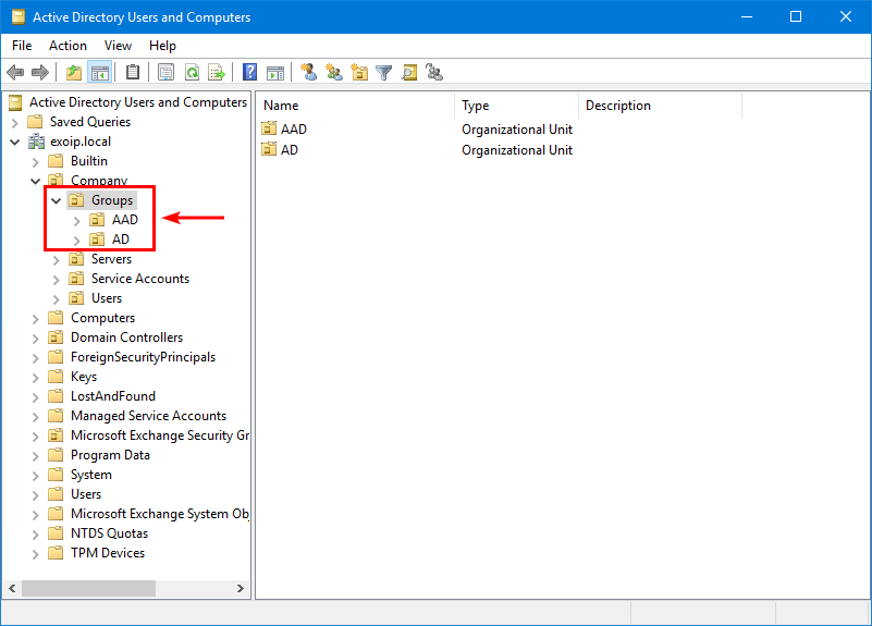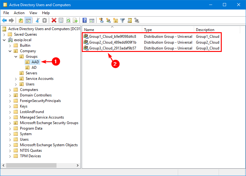 打开Active Directory 用户和计算机,打开 AAD OU,并检查 Microsoft 365 组是否已写回到本地 AD。
