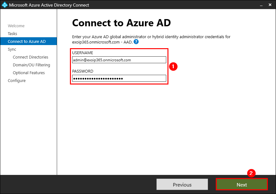 - 在连接到 Azure AD 页面上,输入您的凭据。选择下一个。
