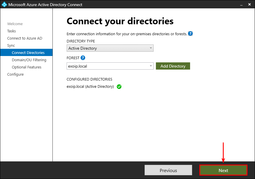 - 在连接您的目录页面上,验证配置目录正确显示并单击下一个。