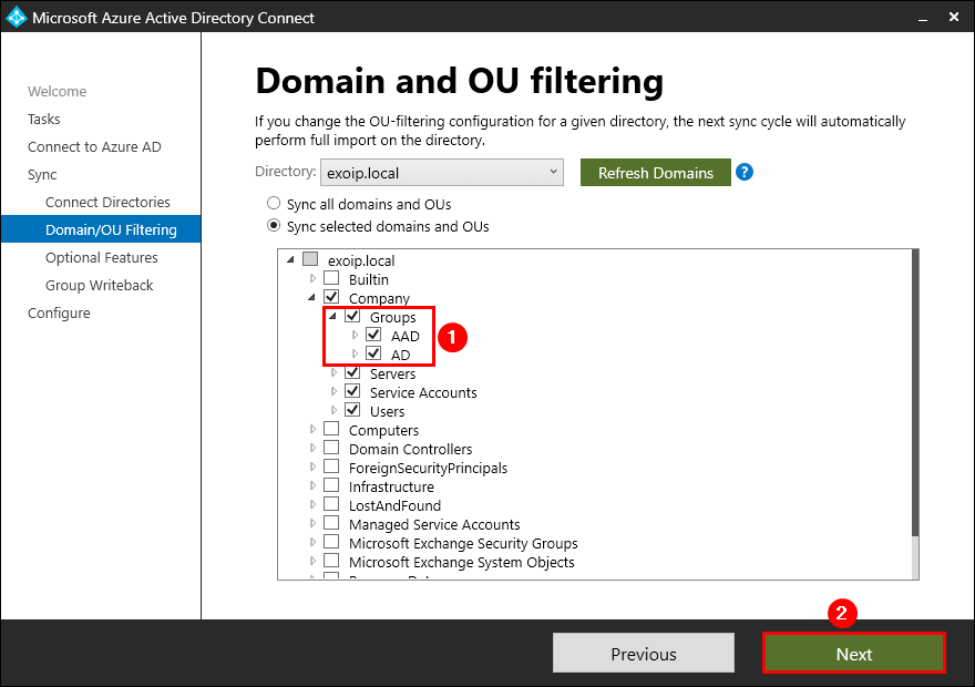 - 在域和 OU 过滤页面上,确保您拥有选定的组(您在上一步中创建的)并单击下一个。