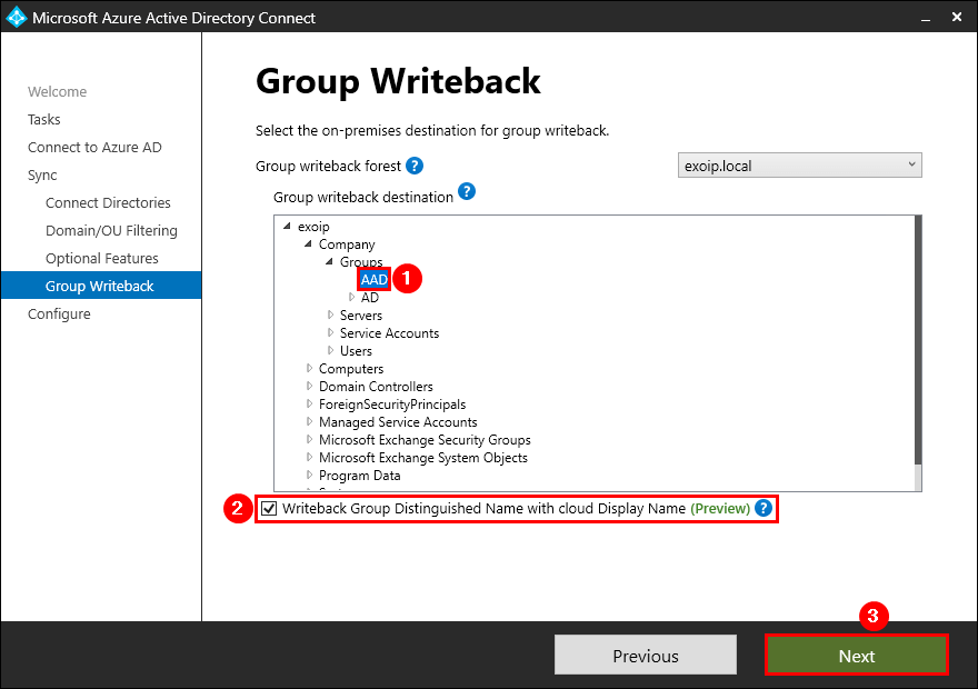 你必须至少有Azure AD 连接版本 2.0.89.0安装或更高版本以在 Azure AD Connect 中启用组写回。