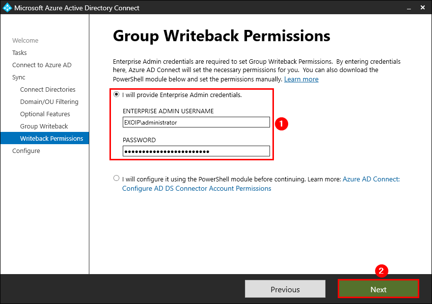 要在 Microsoft Entra Connect Sync 中启用和配置组写回,请按照以下步骤操作: