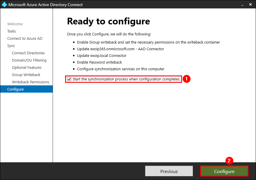 - 在准备配置页面上,选择配置完成后启动同步过程然后单击配置。