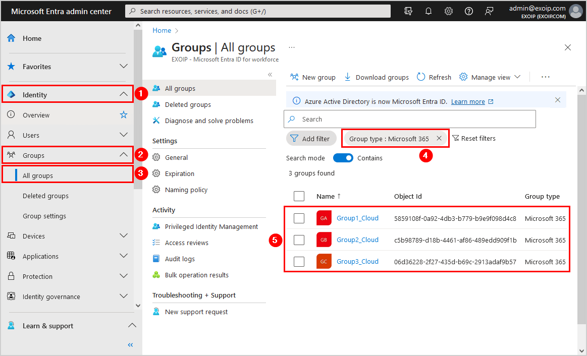 登录到微软 Entra 管理中心。点击身份 > 组 > 所有组。筛选组类型微软365并检查列表中的 Microsoft 365 组。