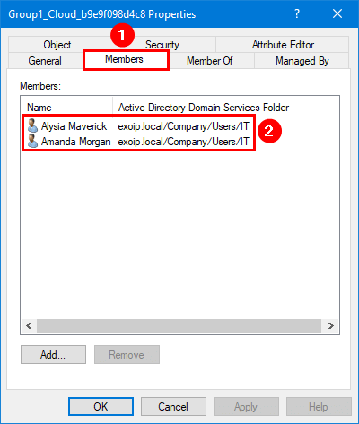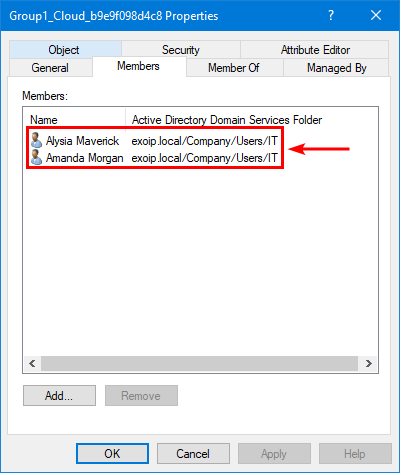 但是,AD 中的同步组中仅出现两个用户。这是因为 CloudOnly 用户是在 Azure AD 中创建的,而不是在本地 AD 中创建的。