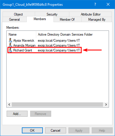 在此示例中,我们将用户 Richard Grant 从本地 AD 添加到 AAD 组。