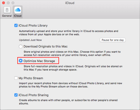 启用后,当iPhone不在存储空间时,全分辨率的照片和视频将被优化版本替换。 iCloud图片库将iCloud中的全分辨率版本保留在iCloud中。当您需要时,您可以通过Wi-Fi或Cellular下载原始照片和视频。