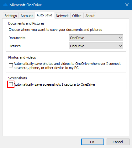 第 2 步:单击自动保存选项卡,然后清除自动将我捕获的屏幕截图保存到 OneDrive盒子。
