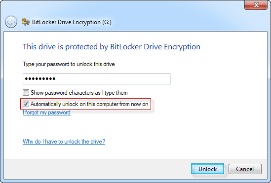 在 Windows 7 中运行,检查自动解锁该计算机上的该驱动器盒子