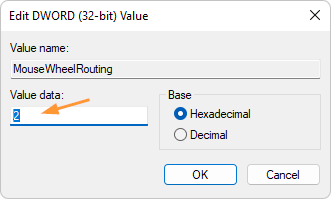 HKEY_CURRENT_USER\Control Panel\Desktop。查找名为 的 32 位 DWORD 值鼠标滚轮路由,然后双击进行修改。