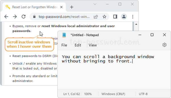 - 此更改将立即生效。启用此功能可以帮助您快速滚动非活动后台窗口,而无需单击或输入焦点。